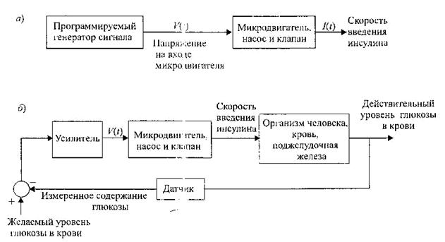 Рис.5.26.Разомкнутая (а) и замкнутая (б) системы управления содержанием глюкозы в крови