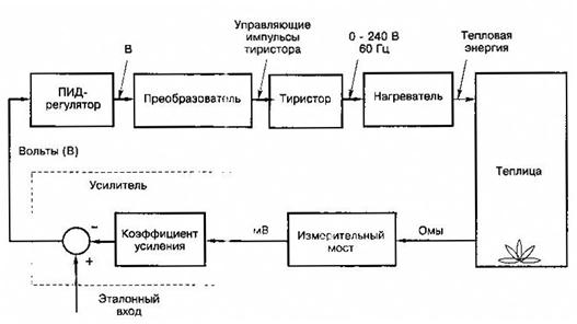 Функциональная схема системы регулирования температуры в помещении приведена на рис.5.28. Температура в помещении измеряется с помощью термистора, включённого в одно из плеч мостовой схемы. Выходной сигнал измерительного моста имеет малую величину (милливольты), поэтому необходим усилитель, чтобы довести напряжение до приемлемого уровня.