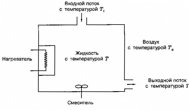 Схема системы регулирования температуры жидкости изображена на рис.5.29. Жидкость с температурой Т вытекает из бака с некоторой скоростью и замещается жидкостью с температурой Тi причём Тi < Т. Температура жидкости в баке повышается с помощью электрического нагревателя. Смеситель обеспечивает равномерное распределение температуры по всему объёму бака, и в общем случае её следует считать функцией времени T(t) /