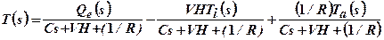 Далее qe+VHTi=CdT/dt+VHT+(T-Ta)/R, где С - теплоёмкость жидкости, являющаяся параметром системы; V – расход жидкости на входе и на выходе из бака (считая их одинаковыми); Н - удельная теплоёмкость жидкости; R – сопротивление тепловому потоку через поверхность бака; Та – температура воздуха снаружи бака.