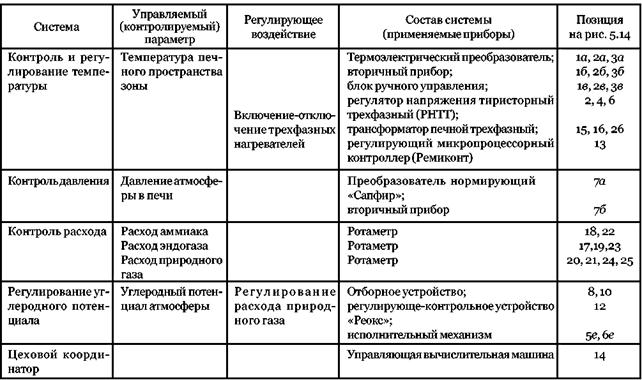 На рис.5.30 приведена функциональная схема автоматизации (контроля и регулирования), а также схема расположения приборов трехзонной протяжной печи для нитроцементации изделий. Эта печь оборудована комплексом контрольно-измерительных приборов, автоматическим регулирующим микропроцессорным контроллером с подключением последнего к цеховой управляющей вычислительной машине (УВМ) (табл.5.7).