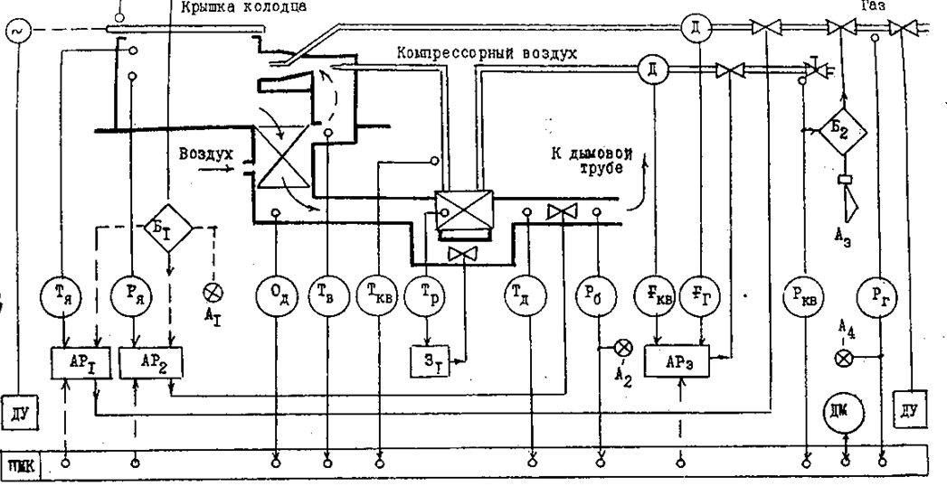Б, З, ДУ и Аi. При открывании крышки колодца снижается до минимума подача газа и воздуха, а также прикрывается дымовой шибер. Предусмотрена защита металлического рекуператора от перегрева за счёт пропуска продуктов горения через обводящий боров. Для перемещения крышки колодца используется система дистанционного управления. При открывании крышки, снижении давления газа, компрессорного воздуха и разрежения в борове подаются звуковые и световые сигналы.