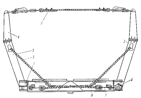 Рис. 8.1. Коник автомобиля: 1 – упор стойки; 2 – канат стойки; 3 – стойки; 4 – наконечник стойки; 5 – канат страховочный; 6 – канат механизма облегчения подъема стоек; 7 – запор каната стойки; 8 – основание коника
