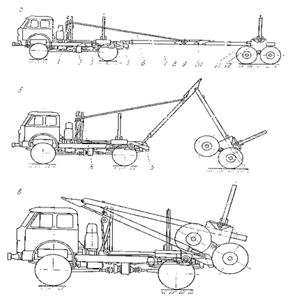 Рис. 8.3. Схема погрузки роспуска на шасси тягача: а – общий вид автопоезда перед началом погрузки; б – процесс погрузки прицепа-роспуска на шасси тягача; в – общий вид автопоезда с погруженным роспуском на шасси тягача