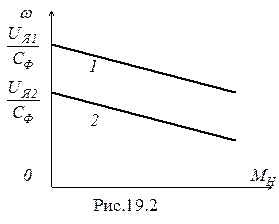 Механическая характеристика представляет собой прямую линию, наклон которой определяется коэффициентом kН, а уровень расположения и, следовательно, диапазон частот вращения определяется напряжением UЯ: при UЯ1>UЯ2 частоты вращения по характеристике 1 выше частот вращения по характеристике 2.