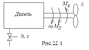 Дизель (рис.22.1), сжигая поступающее в него топливо, развивает механический момент МД и вращает винт с частотой w. Винт оказывает дизелю момент сопротивления МВ. Величина момента МВ зависит от величины разворота l лопастей. Момент и частота вращения дизеля зависит от величины подачи топлива, которая регулируется перемещением h рейки топливного насоса. Если дизель оборудован автоматическим регулятором частоты вращения, то подача топлива определяется величиной перемещения z муфты центробежного датчика скорости.