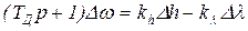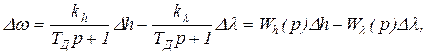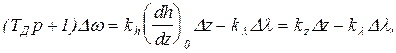 Входными сигналами дизеля по схеме являются величины изменений подачи топлива Dh и разворота Dl лопастей винта. Выходной сигнал - изменение частоты вращения Dw дизеля. Это полностью совпадает с обозначениями сигналов дизеля, приведённых на рис.22.1. Поэтому воспользуемся готовым дифференциальным уравнением дизеля в виде (22.9):