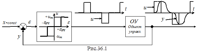 Для автоколебательной нелинейной САУ существует простой, так называемый гармонический метод расчета параметров автоколебания, который по трудоемкости и затратам времени и счета сравним с расчетами линейных САУ. Краткое обоснование гармонического метода состоит в следующем. Пусть нелинейная САУ, в которой существуют автоколебания, имеет структуру, приведенную на рис.36.1. Предположим, что входной сигнал e нелинейности синусоидальный. На выходе нелинейного элемента, каким в данном примере является трехпозиционное реле, сигнал u будет периодическим, но несинусоидальным. Как известно из курса высшей математики, такой сигнал может быть разложен в ряд Фурье, который будет содержать основную гармонику, изменяющуюся с частотой сигнала e и высшие гармоники. Объект управления ОУ реально обладает инерционностью, например, холодильная камера. Поэтому скачкообразные изменения входного для ОУ сигнала u будут вызывать переходные процессы с характерной для экспонент формой. В результате выходной сигнал у объекта управления будет отличаться от входного u тем, что углы сигнала y будут сглаженными. Сигнал у будет периодическим, несинусоидальным, но отличие его от синусоиды будет, как правило, настолько незначительным (это видно из рисунка), что им можно пренебречь. Так как при x=const согласно схемы сигналы х и у отличаются лишь знаком и постоянной величиной х, то по форме они должны быть одинаковыми. Предположив синусоидальность e, мы доказали практическую синусоидальность сигнала у и, следовательно, это предположение оказывается верным.