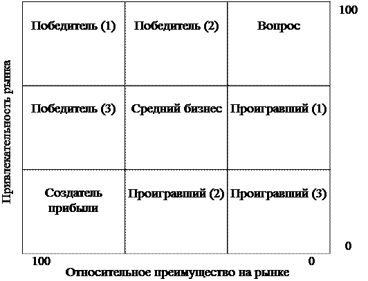 Для Проигравшего 1 характерна средняя привлекательность рынка и низкий уровень относительных преимуществ на рынке (средняя клетка в правом ряду).