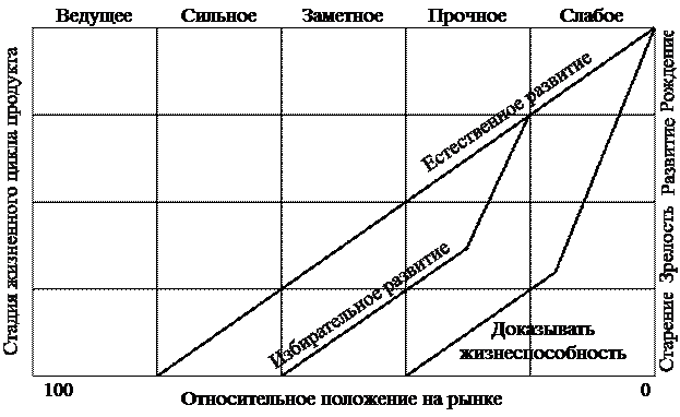 Портфель, состоящий только из зрелых и стареющих видов бизнеса с жизнеспособными конкурентными позициями, вероятно будет на каком-то этапе давать положительный поток денежной наличности и высокую норму прибыли, но перспективным в более длительной перспективе его назвать нельзя. Портфель, объединяющий только зарождающиеся и растущие виды бизнеса, имеет хорошие перспективы, но может иметь отрицательный поток денежной наличности в данный момент.