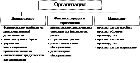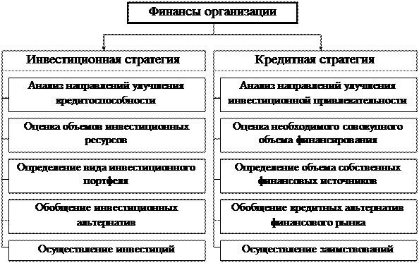 После выработки общей финансовой стратегии организации специальные подразделения в соответствии со стратегией организации, а также в соответствии с состоянием финансового рынка разрабатывают инвестиционную и кредитную стратегии организации. Такой подход позволяет, с одной стороны, "директировать" деятельность подразделений, то есть направить различные аспекты деятельности организации в единое русло (директрису или вектор) в соответствии с миссией организации, а с другой стороны, гибкая и продуманная финансовая стратегия позволяет высшему менеджменту организации планировать развитие прочих направлений деятельности.