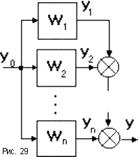 2. Параллельно - согласное соединение (рис.29) - на вход каждого звена подается один и тот же сигнал, а выходные сигналы складываются. Тогда: