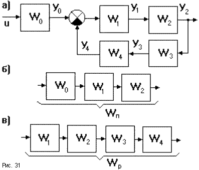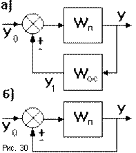 3. Прараллельно - встречное соединение (рис. 30а) - звено охвачено положительной или отрицательной обратной связью. Участок цепи, по которому сигнал идет в противоположном направлении по отношению к системе в целом (то есть с выхода на вход) называется цепью обратной связи с передаточной функцией Wос. При этом для отрицательной ОС: