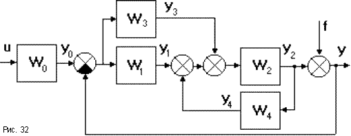 Если многоконтурная система имеет перекрещивающиеся связи (рис.33), то для вычисления эквивалентной передаточной функции нужны дополнительные правила: