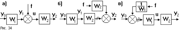 4. При переносе сумматора через звено по ходу сигнала необходимо добавить звено с передаточной функцией того звена, через которое переносится сумматор. Если сумматор переносится против хода сигнала, то добавляется звено с передаточной функцией, обратной передаточной функции звена, через которое переносим сумматор (рис.34).