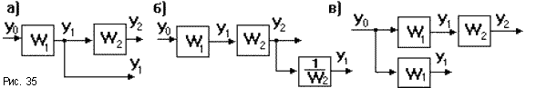 5. При переносе узла через звено по ходу сигнала добавляется звено с передаточной функцией, обратной передаточной функции звена, через которое переносим узел. Если узел переносится против хода сигнала, то добавляется звено с передаточной функцией звена, через которое переносится узел (рис.35).