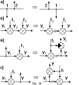 6. Возможны взаимные перестановки узлов и сумматоров: узлы можно менять местами (рис. 36а); сумматоры тоже можно менять местами (рис.36б); при переносе узла через сумматор необходимо добавить сравнивающий элемент (рис.36в: y = y1 + f1 = > y1 = y - f1) или сумматор (рис.36г: y = y1 + f1).