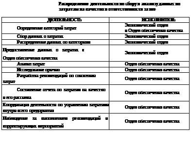 Следует опираться на реальные бухгалтерские данные при получении элементов затрат. При этом сбор и анализ данных должны проводиться специалистами по качеству совместно с экономистами. Распределение деятельности и ответственности за нее может быть следующее (табл. 16):
