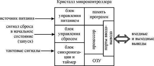 Те, кто не знаком с микроконтроллерами, могут подумать, что это прибор с жестко заданными (стандартизированными) функциями. Это абсолютно не так. Термин «микроконтроллер» - это очень общий термин, содержание которого обычно определяется производителем. «Микроконтроллер — это самостоятельная компьютерная система, которая содержит процессор, вспомогательные схемы и устройства ввода-вывода данных, размещенные в общем корпусе» (рис 1.1)