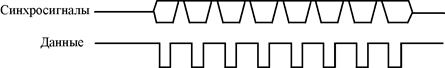 При реализации синхронного обмена вместе с данными посылается синхросигнал, который используется приемником для стробирования данных (рис. 2.30).