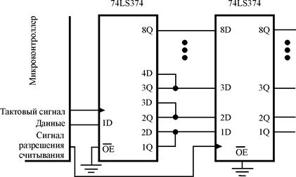 Типичная схема для преобразования последовательных данных в параллельные показана на рис. 2.31. В этой схеме используются две микросхемы 8-разрядных регистров типа 74LS374. Для большинства приложений не требуется включение второго регистра. Это преобразование может также быть выполнено с помощью специальной микросхемы, но некоторые предпочитают использовать 8-разрядные регистры, так как их обычно легче найти, чем другие типы микросхем ТТЛ.