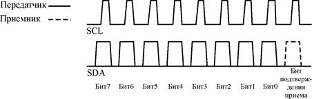 Данные передаются синхронным способом, причем первым посылается старший бит (рис. 2.39). После передачи 8 бит ведущее устройство переводит линию данных в «плавающее» состояние, ожидая подтверждения приема данных от ведомого устройства. Таким подтверждением является установка ведомым устройством низкого уровня сигнала на линии SDA. После бита подтверждения на обеих линиях устанавливается низкий уровень. Затем производится пересылка следующего байта, или шина переводится в состояние конца передачи. Это означает, что передача завершена, и приемник может готовиться к следующему запросу данных.