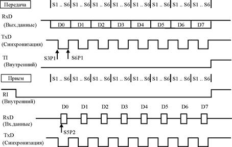 Прием информации инициируется записью в регистр SCON байта управления, очищающего биты SM0, SM1, RI и устанавливающего бит REN. Во втором цикле после этой операции записи в фазе S3P1 на линии TxD появляется «0» первого импульса синхронизации, а на фазе S5P2 выполняется ввод младшего бита данных D0 с линии RxD в сдвиговый регистр. Ввод повторяется в последующих циклах и после восьми сдвигов в регистр вводится старший бит D7, устанавливается флаг TI. После этого подпрограмма обслуживания может прочесть байт данных из SBUF.