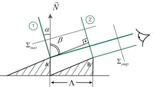 | Обозначения: N-нормаль, α - угол падения, β-угол отражения. |