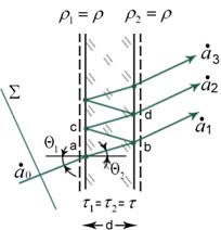 | Rотр1, Rотр2 - коэффициенты отражения 1 и 2 поверхностей, Т- коэффициент пропускания. а0 – амплитуда падающей волны. Между пластинами n>1 ρ, τ –коэффициенты отражения и пропускания по амплитуде. ρ2+τ2=1 |