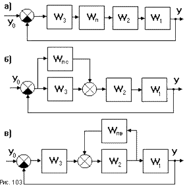 Последовательное корректирующее устройство с передаточной функцией Wп включается обычно после предварительного усилителя. На рис.103а предварительный усилитель имеет передаточную функцию W3, выходной каскад усилителя - W2, исполнительный элемент - W1.