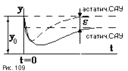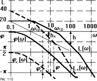 Если в статическую САУ последовательно с регулятором включить астатическое звено с передаточной функцией W = 1/p, то САУ станет астатической, то есть теоретически она будет иметь нулевую статическую ошибку eуст = 0 (рис.109). Если в исходной САУ T1 = 0.5c, T2 = 0.02c, T3 = 0.002c, K = 10, то включение последовательного астатического звена приведет к изменению частотных характеристик, как это показано на рис.110 пунктирными линиями.