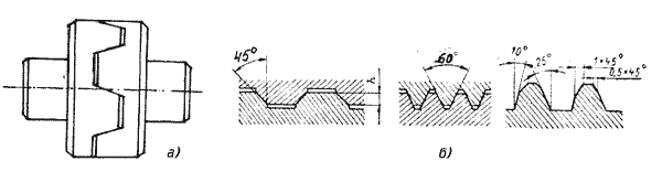 На рис изображена муфта с торцевыми кулачками и некоторые профили кулачков. Выбор формы кулачков определяется в основном условиями включения муфты (одинаковые угловые скорости полумуфт или несколько различные) и передаваемой нагрузкой.