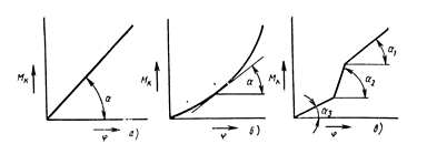 Тангенс угла наклона кривой на графике дает крутильную жесткость которая соответственно имеет постоянное(рис. 8.1, а) или переменное значение(рис.8.1, б и в)