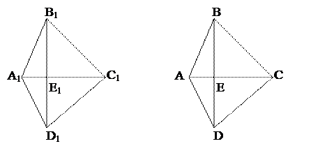 Четыреугольник. Любой четырехугольник А1В1С1D1 , является изображением четырехугольника А1В1С1D1 тогда и только тогда, когда четырехугольники А1В1С1D1 и АВСD является аффинно-эквивалентными (А1В1С1D1 и АВСD, если их обозначили таким образом, что (АС,Е)=(А1С1,Е1), (BD,E)= (B1D1,E1)). Для построения изображения АВСD четырехугольника А1В1С1D1 в качестве вершин А, В, С можно выбрать три произвольные точки, не лежащие на одной прямой. Положение четвертой вершины D определяется однозначно из условий: (АС,Е)=(А1С1,Е1), (BD,E)= (B1D1,E1)).