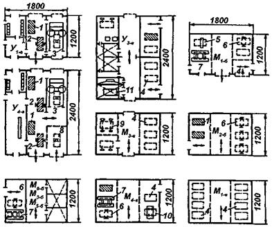 Рис. 2.9. Типовые технологические модули и узлы: 1 – автомобиле – места ожидания; 2 – вспомогательные посты с двухстоечными подъемниками; 3 – моечно – сушильная установка; 4 – рабочий пост; 5 – рабочий пост с тормозным стендом; 6 – рабочий пост с двухстоечным подъемником; 7 – электромеханический четырехстоечный подъемник; 8 – рабочий пост с гидравлическим подъемником; 9 – рабочий пост с опрокидывателем; 10 – рабочий пост с динамометрическим стендом; 11 – окрасочная камера