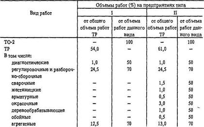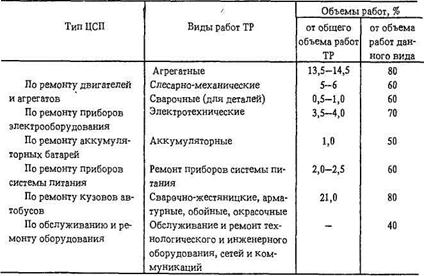 Таблица 7,3. Примерное распределение объемов ТО и ТР по вилам работ, выполняемых на БЦТО и ПТК [20]