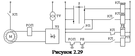 Защита пусковой обмотки от длительного тока осуществляется с помощью реле обрыва поля и реле времени. На рисунке 2.29 приняты обозначения: TV – согласующий трансформатор; РП – реле промежуточное; S – ключ с самовозвратом в исходное положение; РВ – реле с выдержкой времени при отпускании (tуРВ @ tп доп = (10¸60)с).