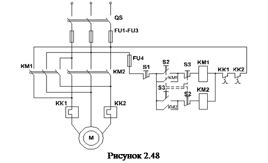 Пример реверсивного магнитного пускателя – на рисунке 2.48, где приняты обозначения: QS – не автоматический выключатель; FU1 ¸ FU2 – предохранители для силовой цепи и цепи управления; KM1, KM2 - реверсивные контактеры; KK1, KK2 – тепловые реле; S1 ¸ S3 – кнопочная станция.