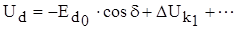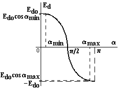 На рисунке 3.25 представлена структурная схема ведомого сетью тиристорного преобразователя, где приняты обозначения: ТП – тиристорный преобразователь; УВ – управляемый выпрямитель; СИФУ – система импульсно-фазового управления; СЧ – силовая часть. В соответствии с рисунком 3.25, регулировочные характеристики ведомых сетью тиристорных преобразователей будут иметь вид, представленный на рисунке 3.26.