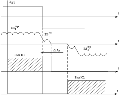 Диаграмма сигналов управления реверсивными комплектами ТП представлена на рисунке 3.37, где приняты обозначения: Еd1ВР – ЭДС в выпрямительном режиме; Е – противо ЭДС двигателя.