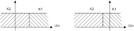 У 3-х позиционных если ½Uзт½< Uпорог, к2 и к1 – разомкн.; Uзт >Uпорог, к1 – замкн., к2 – разомкн.; Uзт <Uпорог, к2 – замкн., к1 – разомкн. (см. рисунок 3.38).