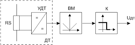 Датчик нуля тока на базе датчика тока представлен на рисунке 3.42, где приняты обозначения: К – компаратор; ВМ – выявитель модуля.