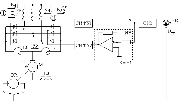 L1, L2 – уравнительные реакторы, которые ограничивают на допустимом уровне уравнительный ток, который протекает всегда в одном направлении от (I) к (II) минуя цепь нагрузки.