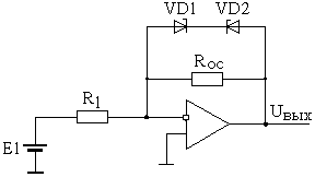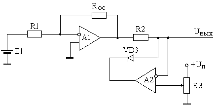 Ограничение Uвых за счет придания схеме с ОУ мягких внешних характеристик и это достигается путем введения в цепь R2 (см. рисунок 3.57в). На нем гасится тот излишек напряжения, на который выходной сигнал ОУ превышает заданный уровень выходного.