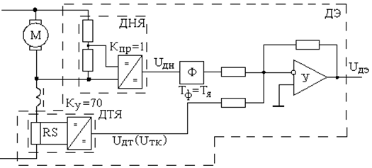 Необходимость включения фильтра на выходе ДН вызвана тем, чтобы исключить из выходного сигнала датчика составляющую пропорциональную падению напряжения на индуктивности Lя, в независимости от источника. В этом случае для получения на выходе усилителя сигнала датчика ЭДС необходимо из сигнала на выходе фильтра вычесть сигнал токовой компенсации Uтк º i×Rя.