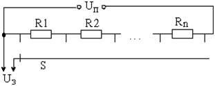 Потенциометрический задатчик с дискретным изменением задающего сигнала представлен на рисунке 3.81, где приняты обозначения: S – галетный переключатель; R1¸Rn – запаянные сопротивления.