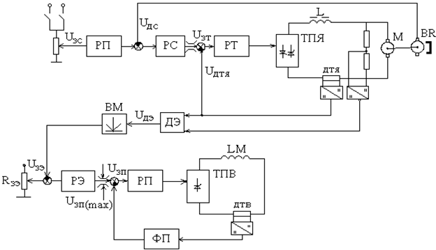 Функциональная схема двухзонного АЭП (с реверсом по ЯД) с зависимым управляемым полем двигателя в функции ЭДС приведена на рисунке 5.52, где приняты обозначения: ВМ – выявитель модуля (нужен, т.к. ЭП реверсивный по Я); ТПВ – нереверсивный; РЭ – регулятор ЭДС; РП – регулятор потока; ФП – функциональный преобразователь (в статическом режиме воспроизводит кривую намагничивания); Rзэ – резистор подстроечный (его устанавливают в момент наладки и дальше не трогают, причем Uзэ º Ен).