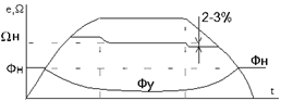 В первый момент изменение напряжения на якоре двигателя вызывает увеличение напряжения якоря, увеличивается скорость и увеличивается сигнал ДЭ. Последний вызовет выход РЭ с ограничения и сформирует сигнал задания на поток, соответствующий полю меньше номинального, которое будет отработано контуром потока (КП). В результате все увеличение скорости, первоначально вызванное увеличением напряжения, будет достигнуто за счет ослабления поля ЭД. Ослабление поля прекратится, когда сигнал Uдэ = Uзэ, который в свою очередь установлен на уровне Ен.