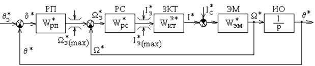 Структурная схема позиционного АЭП в относительных единицах приведена на рисунке 6.9. Сама система осталась 3-х контурной, но мы свернули контур тока.