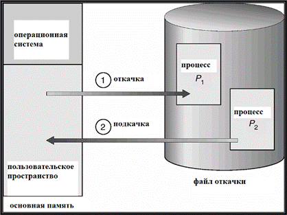 Откачка и подкачка (swapping) – это действия операционной системы по откачке (записи) образа неактивного процесса на диск или подкачке (считыванию) активного процесса в основную память. Необходимость выполнения подобных действий вызвана нехваткой основной памяти.